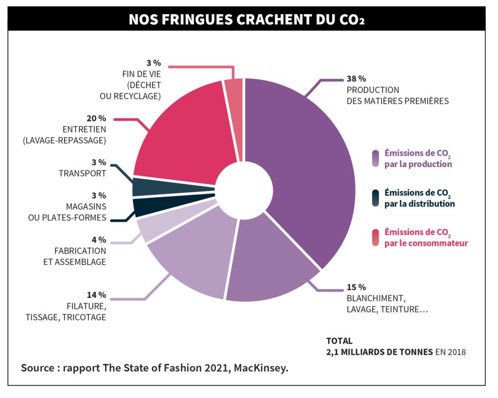 Prolonger la durée de vie des vêtements qui dorment au fond de nos placards : à première vue, difficile de se dresser contre la promesse de ces plateformes. Pour fabriquer et teindre nos habits, il faut des milliers de litres d’eau – 7 500 pour un jean, selon l’ONU – sans compter les émissions de gaz à effet de serre liées à la transformation des fibres textiles comme le coton ou le polyester, dérivé du pétrole, ainsi que le transport des marchandises. Selon un rapport du cabinet McKinsey, la mode a émis l’équivalent de 2,1 milliards de tonnes de CO2 en 2018, ce qui représenterait environ 4 % du total des émissions mondiales de gaz à effet de serre. Les Nations Unies évoquent un pourcentage variant de 2 à 8 %.
