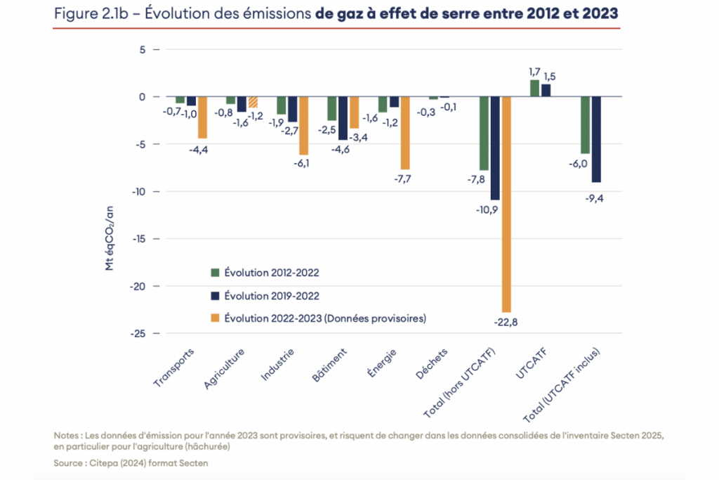 Les émissions ont diminué dans presque tous les secteurs étudiés. L’énergie et le bâtiment respectent largement leur budget carbone. L’agriculture, l’industrie et les transports y parviennent, mais avec une marge plus réduite. En l’absence de politique crédible, le secteur des déchets est le seul (hors puits de carbone) qui n’atteint pas ses objectifs annuels.