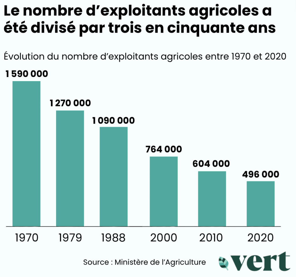 Première puissance agricole en Europe, la France y consacre près de la moitié de son territoire (44,8%). Entre 2010 et 2020, le pays a perdu 100 000 fermes ; il en compte 390 000 aujourd’hui. Malgré cet effondrement, la surface cultivée n’a pas diminué à l’échelle française en raison de l’élargissement des exploitations. Leur superficie moyenne atteint 69 hectares en 2020, soit 13 de plus qu’en 2010.
