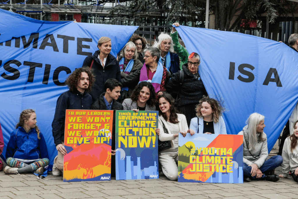Des membres de l’association qui a fait condamner la Suisse pour inaction climatique, à Strasbourg, le 9 avril. © Greenhouse communications