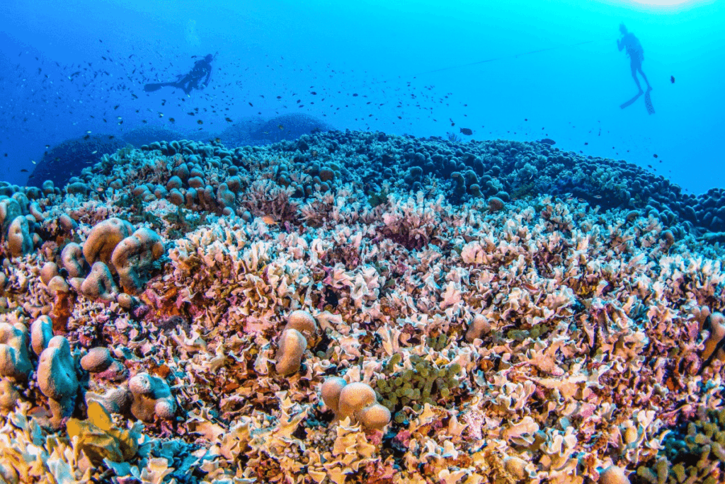 Des plongeur·ses explorent le plus grand corail du monde le 24 octobre dernier, aux Îles Salomon. © Manu San Felix / National geographic Pristine seas via AFP