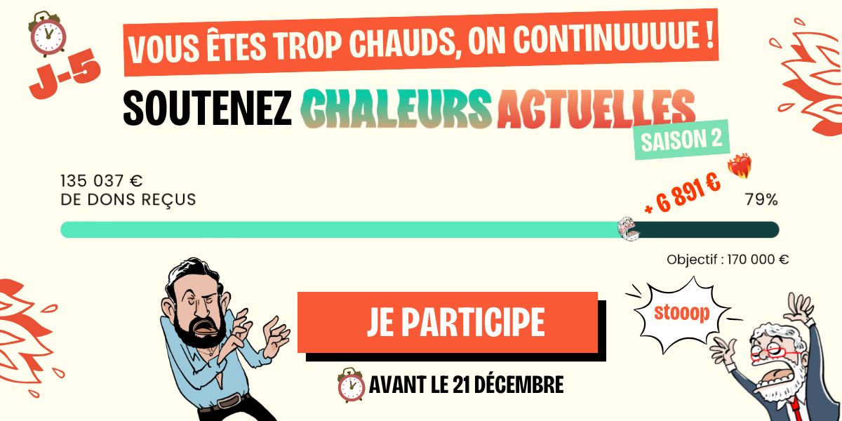 ⏰ Alors que nous sommes à deux doigts d’atteindre notre objectif, synonyme d’une saison 2 de Chaleurs actuelles avec son lot d’enquêtes, de décryptages et de tutos pour toutes et tous, notre campagne se prolonge jusqu’à ce dimanche. À J-5, plus que jamais, engagez-vous avec nous pour gagner ensemble contre la désinformation et profitez de nombreux avantages 💪