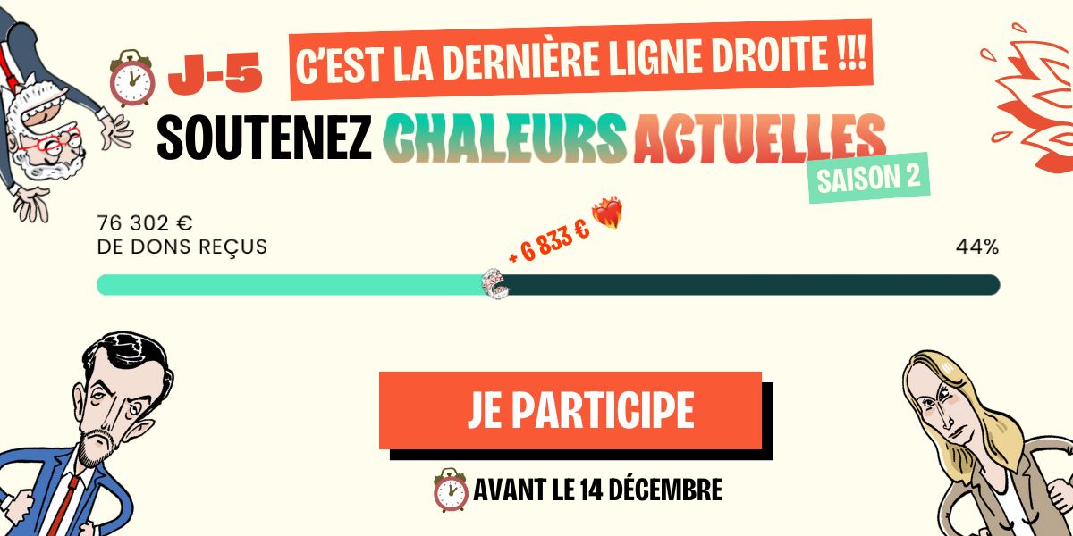 ⏰ J-5 : Il nous reste cinq jours pour accomplir une folie et faire de Chaleurs actuelles un projet incontournable contre la désinformation en 2026. Vous êtes chauds bouillants depuis ce week-end, mais il nous manque encore 90 000 € pour financer un journaliste à plein temps, des décryptages et enquêtes sur les climatosceptiques et l’extrême droite, des vidéos de débunk et des tutos sur l’IA… On compte sur vous dans cette dernière ligne droite ❤️🔥