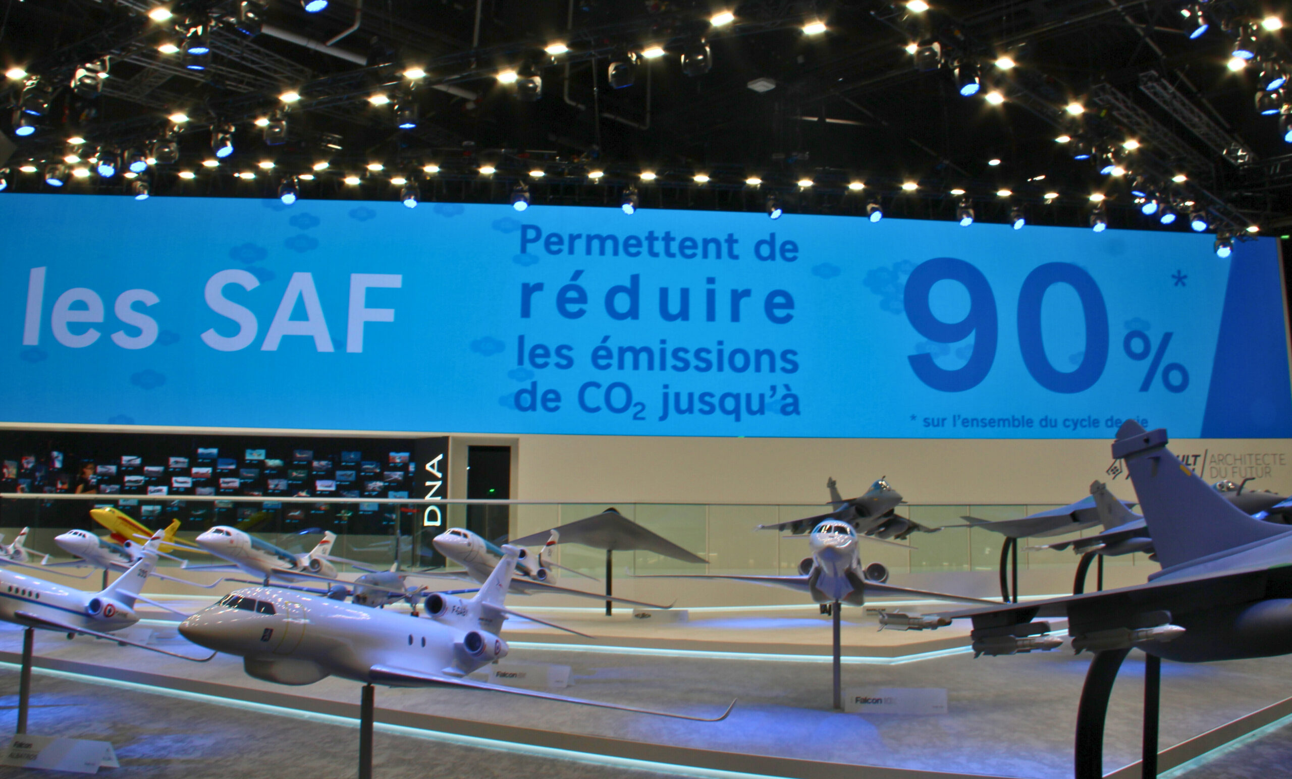 Alors que le trafic aérien retrouve son niveau d’avant Covid, le salon privilégie le «toujours plus». Sur les énormes stands de l’armée de l’air boostés par la guerre en Ukraine, ou chez les vendeurs de jets privés, on a seulement accolés les lettres SAF, pour «sustainable aviation fuels» – tous les nouveaux modèles sont ainsi présentés comme compatibles avec des «carburants durables». Fabriqués à partir d’huiles de cuisson, de graisses animales récupérées des abattoirs ou de résidus de biomasse, ces nouveaux combustibles font pourtant déjà face à un manque de gisements, alors qu’ils représentent aujourd’hui seulement 1% des carburants consommés dans le monde.