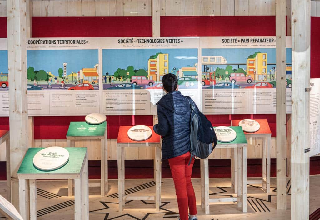 Là, un jeu de l’oie à taille humaine interroge la capacité des visiteurs à modifier leur manière de se déplacer pour atteindre la neutralité carbone, à partir des différents scénarios de l’Ademe (notre article). Plus loin, une tablette géante qui fait office de table de restaurant invite à s’asseoir et choisir un menu. À la fin du «repas», un bilan carbone des aliments sélectionnés remplace la traditionnelle addition. «On a beaucoup réfléchi à comment mettre en scène les différents contenus pour faire passer le message efficacement», confirme Adrien Stalter.