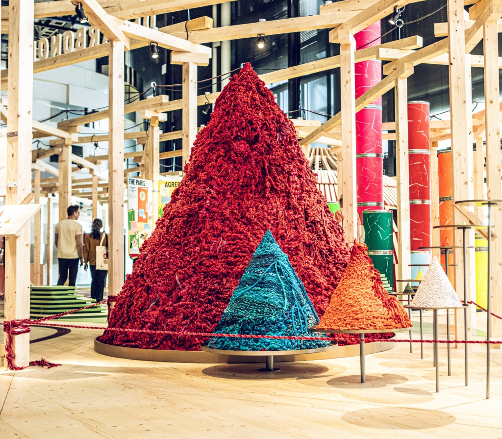 En déambulant à travers les différents espaces, on est surpris·es par la diversité des formats utilisés pour raconter l’urgence climatique. Ici, des cônes de laine colorée de tailles diverses dévoilent les émissions de gaz à effet de serre associées à la production de plusieurs aliments : 27 kgs de CO2eq pour un kilogramme de bœuf, 9 kgs pour le poisson, 2 kgs pour le riz, et 0,3 kg pour la pomme de terre (l’aliment le plus vertueux de la liste !).