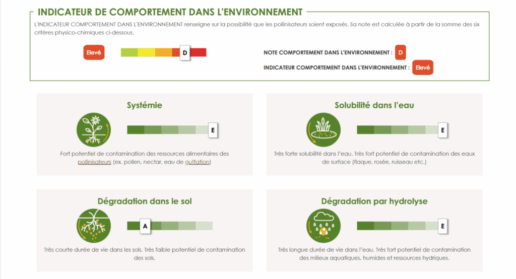 Persistant dans l’environnement. Il faut attendre en moyenne 420 jours pour qu’il disparaisse de moitié dans l’eau. Les néonicotinoïdes ont aussi la capacité d’imprégner l’ensemble de l’intérieur des plantes, des racines jusqu’aux fleurs.