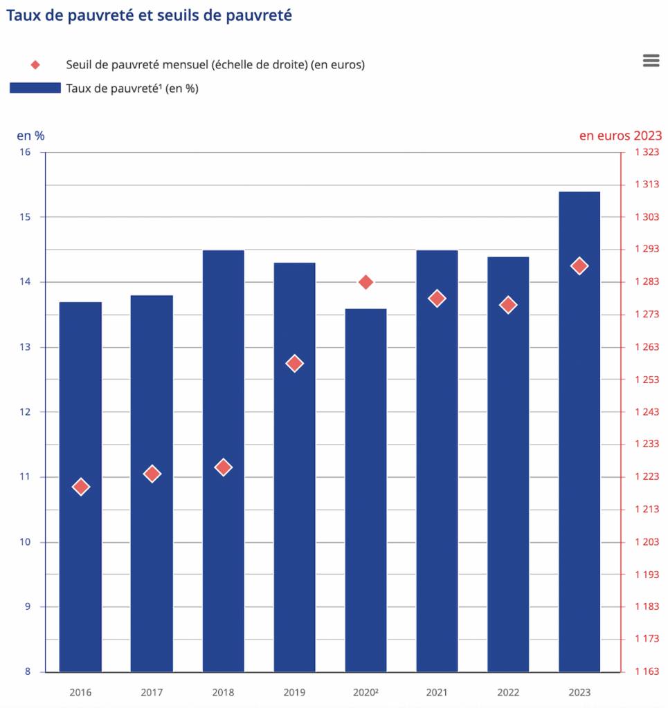 Aujourd’hui, 9,8 millions de Français·es vivent sous le seuil de pauvreté (60% du niveau de vie médian, c’est-à-dire 1 288 euros par mois pour une personne seule, selon l’Insee).