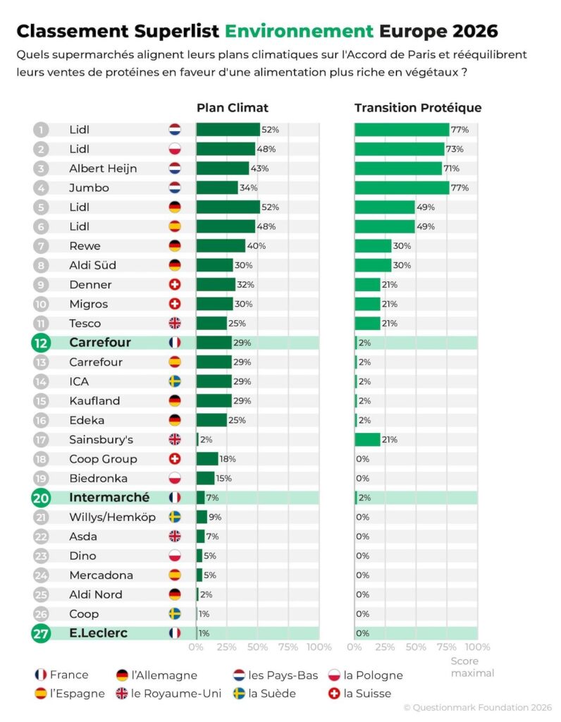 Le centre de réflexion néerlandais QuestionMark a analysé les feuilles de route climatiques de 27 distributeurs européens, ainsi que leurs efforts pour promouvoir une alimentation plus végétale. Les Français Carrefour, E.Leclerc et Intermarché font figure de mauvais élèves.