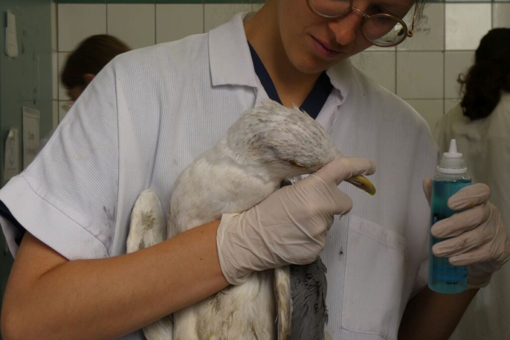 Dans le laboratoire, un héron cendré enfermé dans un carton n’arrête pas de bouger. Les grammages de nourriture pour chaque espèce d’oiseaux sont indiqués sur le carrelage au mur ; Corentin remplit les pipettes au millimètre près. Le jeune homme, cuisinier la semaine, vient prêter main forte en tant que bénévole sur ses jours de congés. Les «deux derniers mois ont été denses au centre», dit-il. «Doucement, doucement», chuchote Akal, en service civique. À deux, ils et elles gavent et réhydratent un goéland du marais de Brière atteint de botulisme.