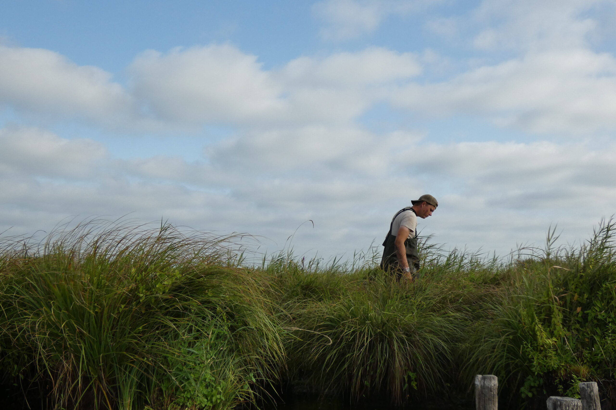 La tâche est plus rude que prévue. Quand la barque s’embourbe dans la vase, il faut continuer à pied. Plus tôt, vers 7 heures du matin, chacun·e a enfilé une «waders», une salopette de pêcheur qui monte jusqu’à la poitrine, avec des bottes intégrées. En descendant du chaland, le journaliste qui écrit ces lignes s’embourbe honteusement dans 25 centimètres d’une boue épaisse : «ça arrive à tout débutant», rassure le guide. Il faut bien cinq minutes pour s’en extraire. Bilan : la veste est foutue, l’appareil photo sale mais fonctionnel, ouf, la recherche peut se poursuivre.