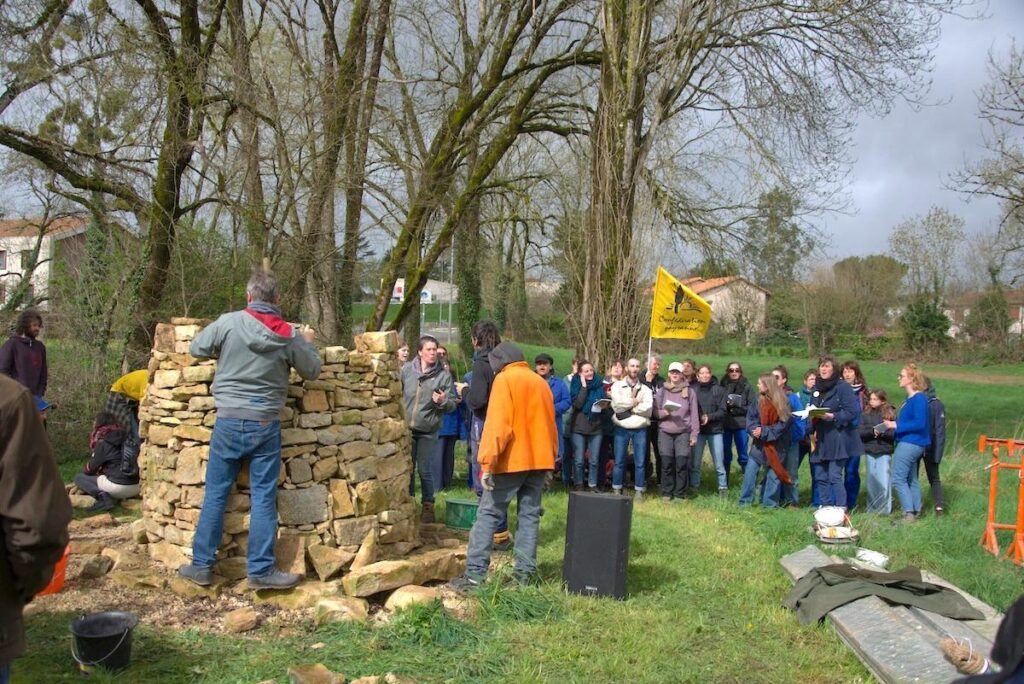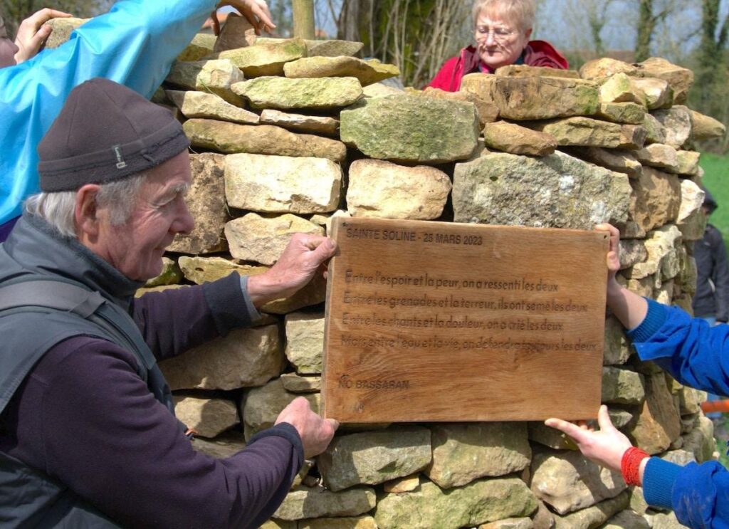 Ce dimanche, les militant·es sont venu·es construire un cairn – un monticule de pierres marquant un lieu symbolique – en mémoire des 200 manifestant·es blessé·es de Sainte-Soline. Reconstruire, plutôt. Un premier cairn érigé douze mois après la mobilisation avait été détruit à l’été 2024. Les coups de maillet sur la pierre dorée rappellent le tintement régulier des 2 000 grenades qui ont fusé il y a deux ans, lors de la manifestation sanglante contre la mégabassine.
