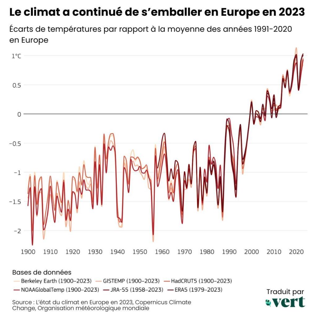 2023 est la première ou la seconde année (selon les méthodologies et bases de données utilisées) la plus torride jamais mesurée sur le Vieux continent. La température moyenne fut d’environ 2,5°C au-dessus des niveaux préindustriels (moitié du 19ème siècle). Les trois années les plus chaudes enregistrées l’ont toutes été depuis 2020.