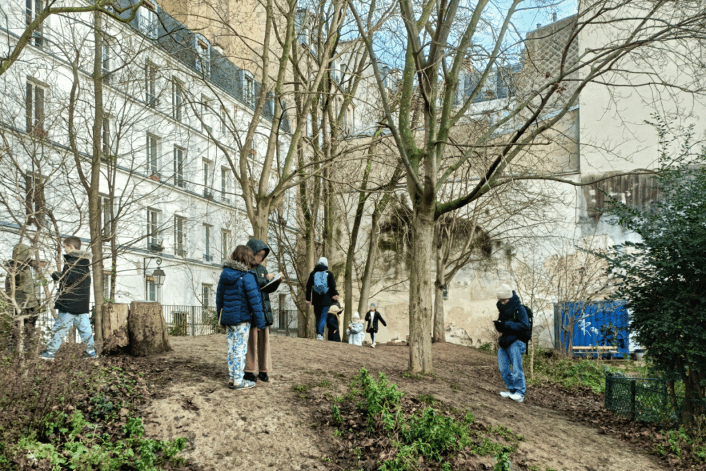 Vêtus de bonnets et d’écharpes pour résister au vent froid, les enfants sont prêt·es à faire classe dehors. Au programme de la matinée : apprentissage d’une poésie de Jacques Prévert, en mouvement. «Au début, j’imaginais ces moments comme une simple extension de la classe, où nous faisions simplement des cours de maths en extérieur. Puis, j’ai exploré comment proposer aux élèves des activités en interaction avec l’environnement», raconte Nathalie Barret.