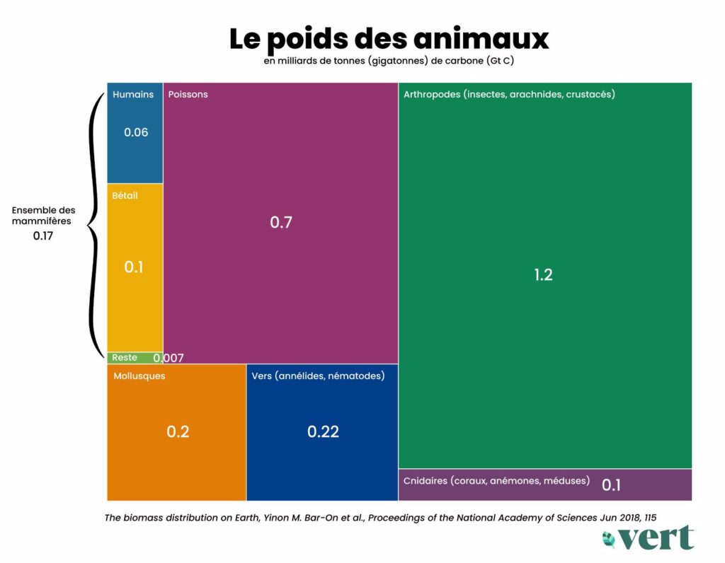 Au-delà du poids prédominant des végétaux, l’étude fait apparaître l’immense influence des humains puisque la masse des mammifères est presque uniquement constituée d’humains et de bétail. Autre enseignement : les humains ne pèsent pas bien lourd comparés à certains autres animaux : la masse des arthropodes (insectes, arachnides et crustacés) est 20 fois supérieure à la nôtre.