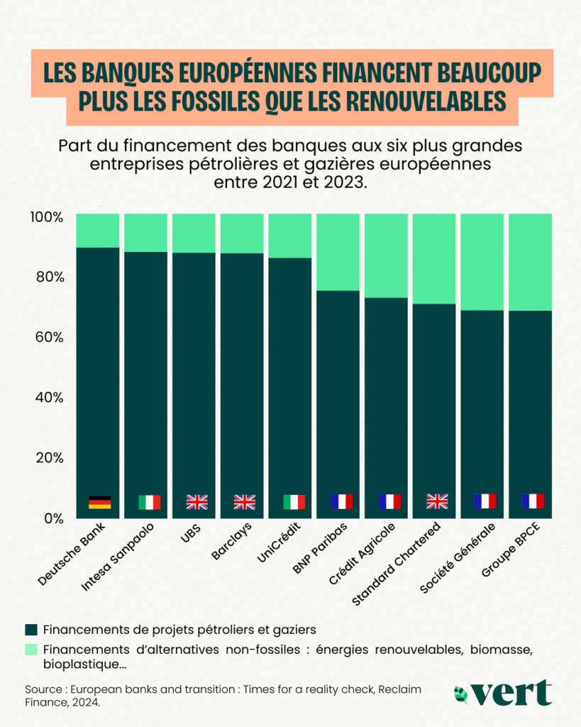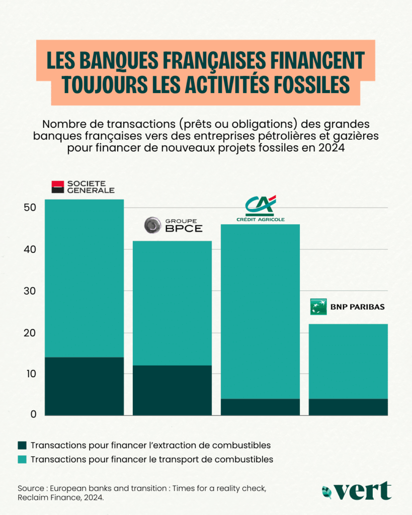→ Plusieurs banques françaises (Société générale, Crédit agricole, BNP Paribas…) financent des énergies fossiles ou de la déforestation et alimentent ainsi la crise climatique.