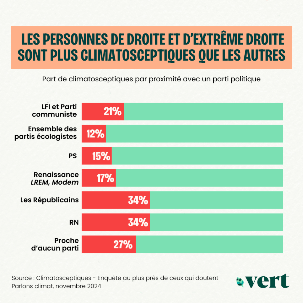 Enfin, un facteur partagé par l’ensemble des climatosceptiques en France est leur défiance à l’égard des écologistes. Alors que ces individus ont souvent une perception positive de l’écologie, surtout à une échelle locale, elles et ils éprouveront un sentiment négatif très fort envers les écologistes, dont ils jugent le discours trop culpabilisant ou contraire à leur valeurs.