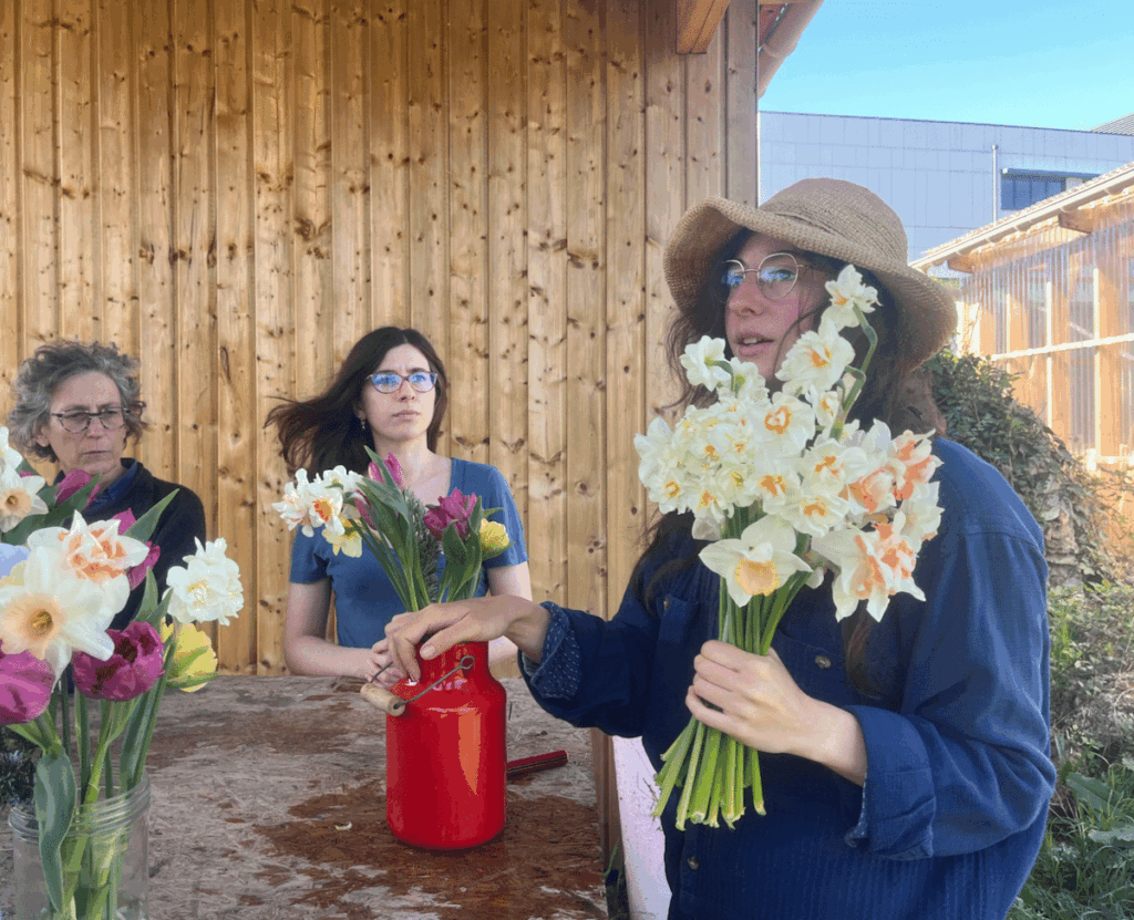 En ce premier week-end d’avril, ce lieu singulier rouvre ses portes au public. Une dizaine de visiteur·ses viennent s’initier à l’art du bouquet. «J’aime beaucoup les fleurs, mais je n’en achète quasiment jamais, confie Marion, l’une des participantes du jour. Ça ne me plaît pas trop qu’on les fasse venir par avion pour qu’elles durent trois jours. J’avais envie de comprendre comment on arrive à produire des fleurs locales, ici, à Montreuil.»