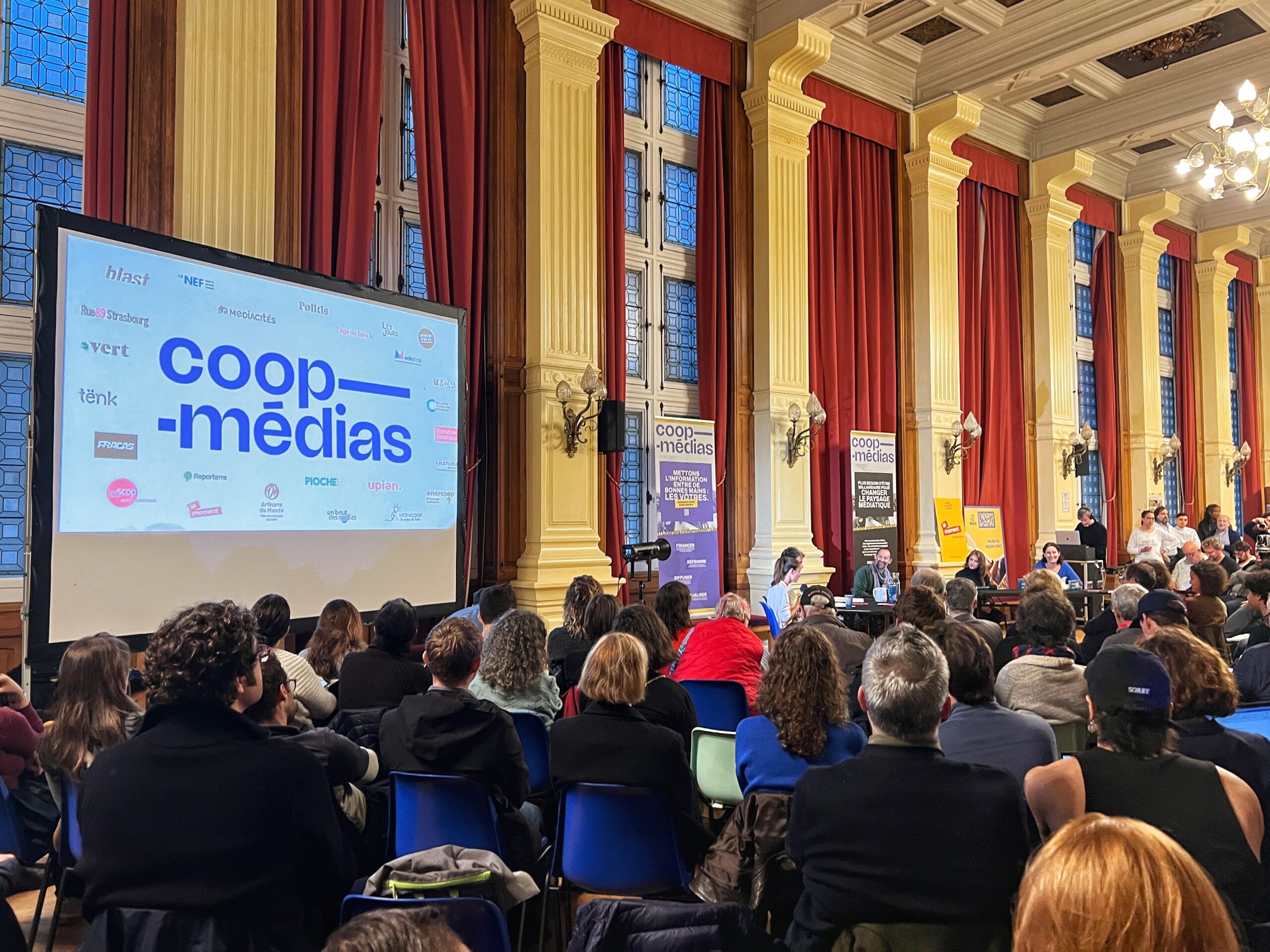 Pour présenter le fonctionnement de la coopérative, journalistes, membres de l’ESS et de la société civile défilent au micro. Toute la soirée, une émission de radio en public, diffusée sur le site du média coopératif Le moment, accueille des tables rondes pour imaginer un nouveau modèle économique pour les médias indépendants.