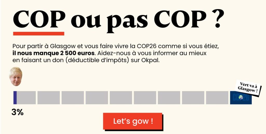 Pour d’autres, comme France Inter, TF1 ou le Figaro, dépêcher des journalistes à travers l’Europe peut se faire en un claquement de doigts. Pour un petit journal indépendant comme le nôtre, c’est plus compliqué. Transport, logement, frais sur place… Pour couvrir les deux semaines que durera la COP26, nous avons estimé nos besoins à 2 500€. Nous nous en remettons à vous, chères lectrices et lecteurs, pour que vous nous envoyiez à Glasgow.