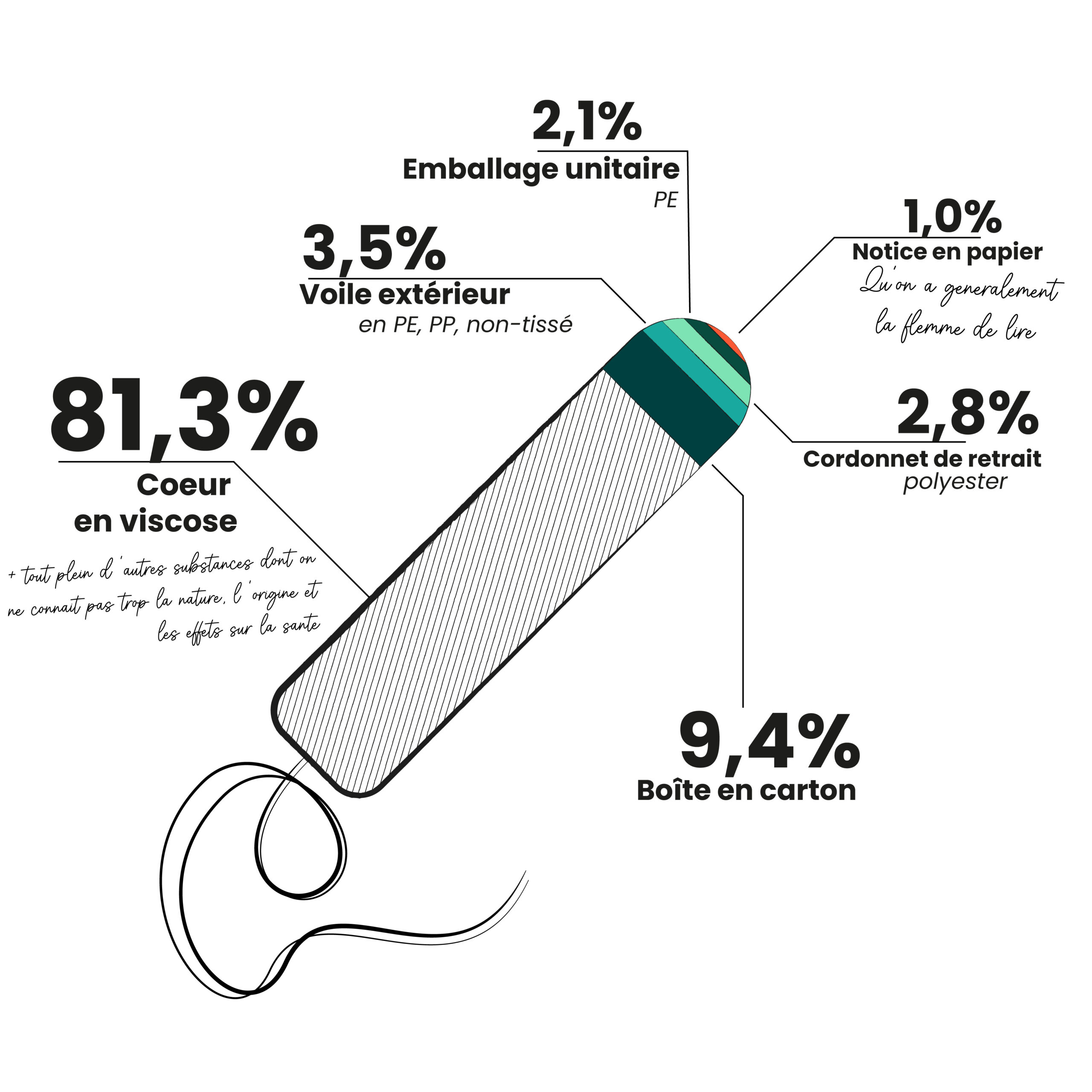 Exemple de répartition en poids des différents composants d’un tampon (sans applicateur) ©Pierre ROUVIERE | @Ecolo_mon _cul