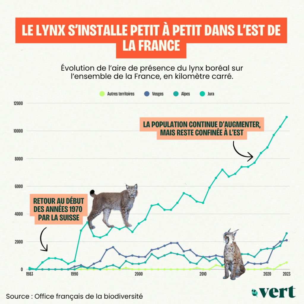 Au fil du temps, trois noyaux de population se sont consolidés à l’est de la France : dans le massif jurassien – qui concentre l’essentiel des quelque 200 individus aujourd’hui estimés dans le pays –, celui des Vosges (qui a connu une tentative de réintroduction peu fructueuse dans les années 1980) et plus récemment dans le nord des Alpes. «Son aire de présence augmente, mais pas comme elle aurait dû, car il y a énormément de mortalité, regrette Gilles Moyne. En 50 ans, le lynx a à peine franchi l’autoroute A6 et la Saône.» Le lynx boréal (lynx lynx) est classé «en danger» sur la liste rouge française des espèces menacées.