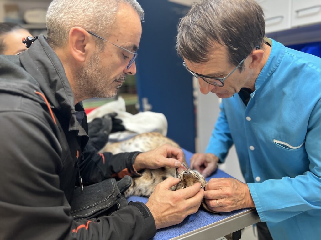 Arrivés à la clinique vétérinaire, les deux jeunes lynx sont endormis tour à tour et allongés sur une table d’examen. Masque sur la bouche et mains gantées, le docteur Frédéric Violot les osculte un par un. Bénévole au centre Athénas depuis ses débuts, le Jurassien a vu passer de nombreux lynx : «Je me suis inspiré de ma connaissance des chats, dont la biologie est assez proche», rit-il en nettoyant les oreilles aux fins pinceaux noirs de ses deux patients du jour.