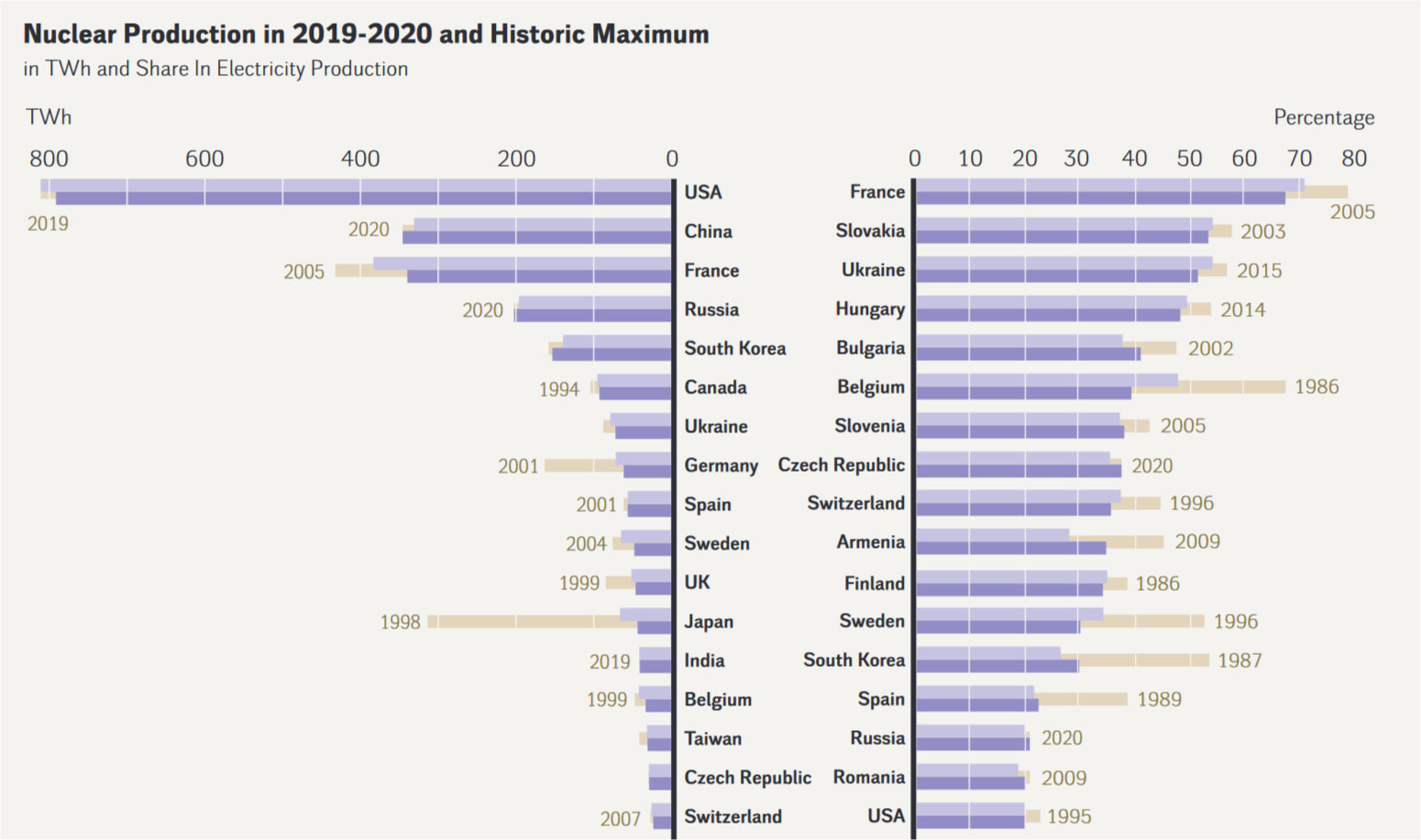 Même du côté de la France, grand promoteur de l’énergie nucléaire, qui représente près de 74% de sa production d’électricité (RTE). L’an dernier, la centrale de Fessenheim (Haut-Rhin) a été mise à l’arrêt. La production nucléaire française a chuté de 12%, au plus bas depuis 27 ans. Pour la première fois, la Chine a dépassé la France, la reléguant à la troisième place du classement des pays produisant le plus d’électricité d’origine nucléaire, à la tête duquel se situent toujours les États-Unis.