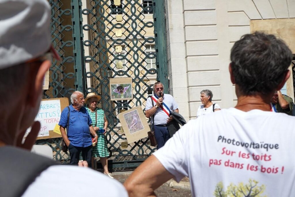 Sur la place pavée, des sympathisants de l’Association Environnement Lot Célé vendent des tee-shirts floqués du slogan «Sur les toits, pas dans les bois». Nadine, institutrice à la retraite, a fait le déplacement pour «empêcher la destruction du patrimoine naturel» et par solidarité envers les autres pays menacés par TotalEnergies, au-delà des frontières du Quercy. «C’est intolérable qu’une multinationale qui fait de l’extractivisme en Ouganda et en Tanzanie (notre article) puisse faire du renouvelable dans le Lot. Elle maquille son écocide en développement durable, c’est de la supercherie». Pour cette habitante de Cahors, «si l’État ne veut pas servir l’intérêt général, c’est aux citoyens de se mobiliser».