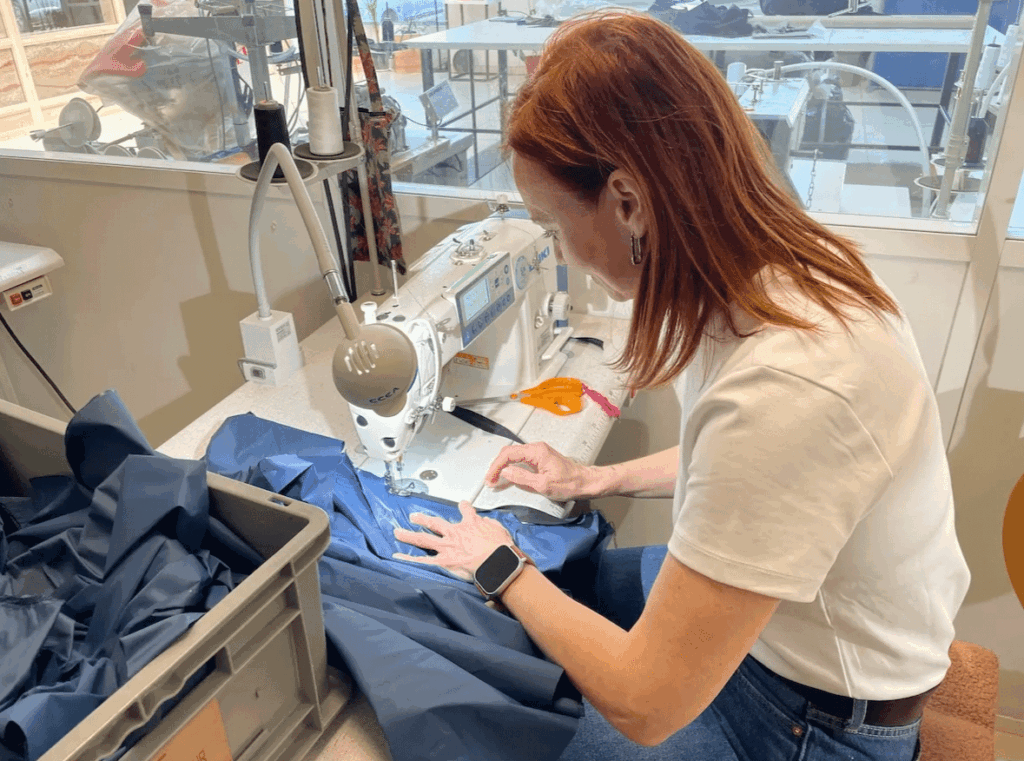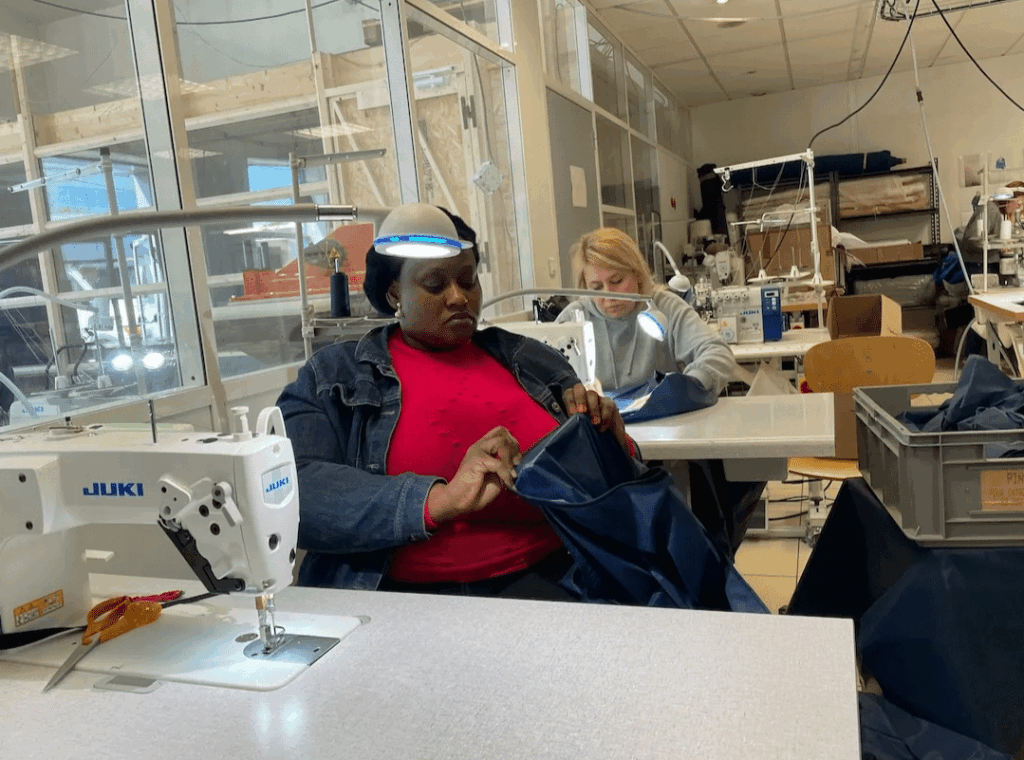 À l’atelier, situé dans un grand hangar, les projets ne manquent pas. L’équipe travaille sur des housses de vélo recyclées pour une marque nantaise ; des cirés, créés à partir de voiles de bateau pour un palace haut-de-gamme en Corse ; et des caleçons façonnés à partir de vieux draps.