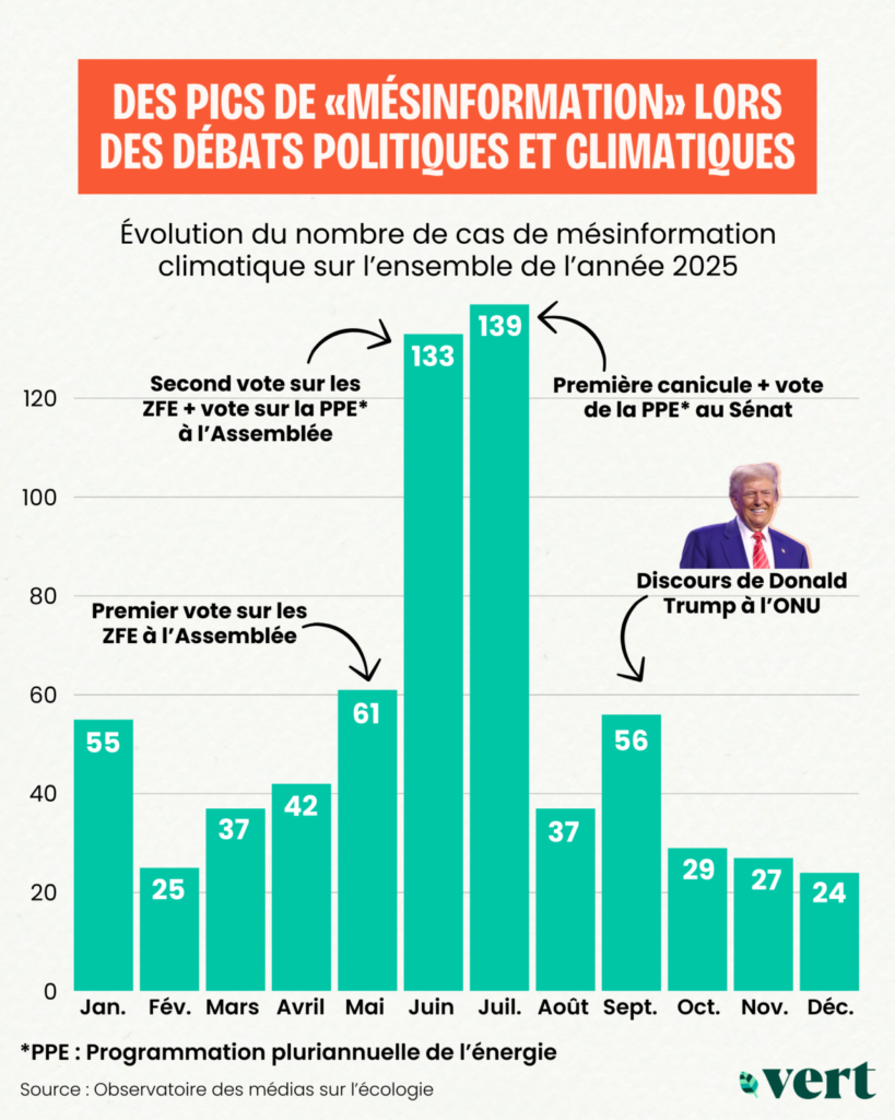En 2025, les pics de mésinformation climatique ont logiquement coïncidé avec les périodes de forte médiatisation des enjeux liés à l’écologie. Les mois de juin et juillet concentrent à eux seuls une part importante des cas recensés – 133 et 139 séquences respectivement – dans un contexte marqué par la canicule et les débats autour de la Programmation pluriannuelle de l’énergie (PPE). «À chaque fois que la PPE était rediscutée, des chiffres erronés sur le coût des énergies renouvelables refaisaient surface», détaille Eva Morel, secrétaire générale de QuotaClimat.