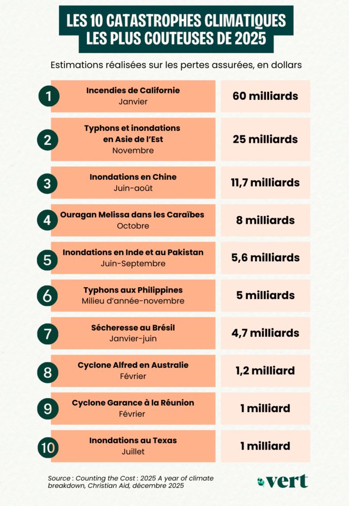 Viennent ensuite les inondations dévastatrices en Chine, qui ont contraint des milliers de personnes à se déplacer, causé 11,7 milliards de dollars (10 milliards d’euros) de dégâts et fait au moins 30 morts au mois de juillet. Puis l’Ouragan Melissa, qui a touché les Caraïbes fin octobre, provoquant des pertes d’une valeur estimée à 8 milliards de dollars (6,7 milliards d’euros) en Jamaïque, à Cuba, et dans les Bahamas.