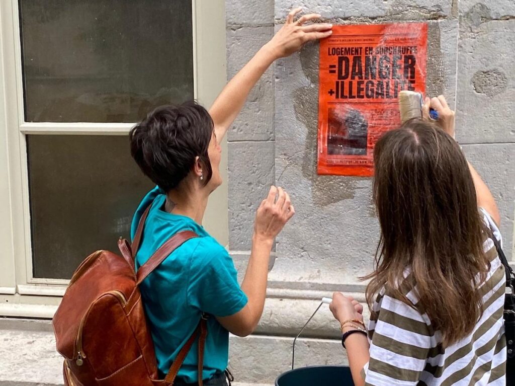 Des membres de l’association placardent des affiches sur les immeubles lyonnais les moins adaptés à la chaleur afin de sensibiliser leurs habitant·es aux moyens d’agir. © Locataires Ensemble