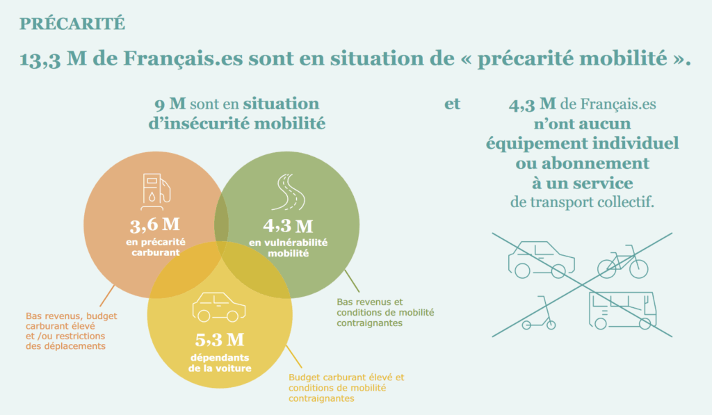 À cela s’ajoutent 4,3 millions de Français·es (soit 8,5 % de la population de plus de 18 ans) qui n’ont aucun équipement individuel ou abonnement à un service de transport collectif. Parmi ces personnes en voie d’exclusion : les foyers gagnant moins de 1 500 euros nets mensuels sont particulièrement représentés (16 % d’entre eux), ainsi que les demandeur·ses d’emploi (18 % d’entre elles et eux) et les non-diplômé·es (20 %).