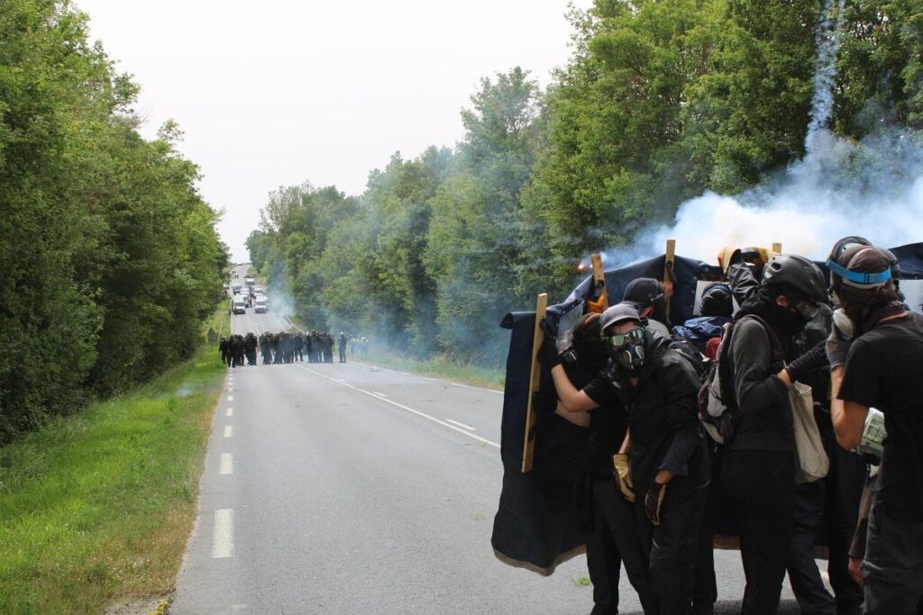 À la vue des dizaines de camions et des blindés, certain·es sont resté·es loin derrière : «Je laisse la violence à ceux qui sont équipés pour ça, confie Tom, 30 ans. Je n’étais pas à Sainte-Soline, mais je sais que ça peut vite dégénérer et tourner au drame. On ne devrait pas en arriver là pour un projet complètement hors du temps.»