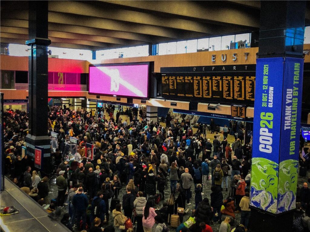 Le message « COP26 : merci de voyager en train » martelé sur de nombreux panneaux de la gare de Londres Euston avait une saveur particulière, dimanche après-midi, alors que des milliers de personnes patientaient – de longues heures durant – dans l’attente de savoir comment se rendre dans le nord du Royaume-Uni. Parmi la foule, de nombreux délégués de plusieurs nations, des scientifiques, des membres d’ONG et même des journalistes, dont l’auteur de ces lignes. Même le ministre britannique de l’environnement Zac Goldsmith a dû se résoudre à prendre l’avion (Guardian).