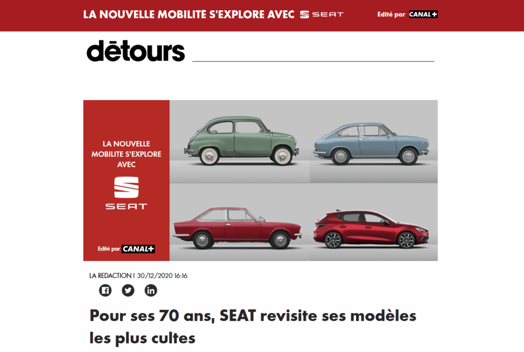 Détournement journalistique. Fruit d’un partenariat entre Canal+ et Seat, le média Détours, spécialisé dans les mobilités, n’hésite pas à faire la promotion de la marque automobile au milieu de contenus éditoriaux. S’il n’est pas illégal, ce mélange des genres est très discutable sur le plan déontologique.