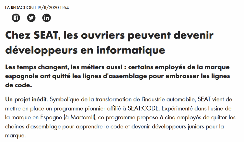 Cette technique de marketing s’appelle le « native advertising », soit de la publicité native. Il s’agit de reprendre la charte graphique et les codes d’écriture du site pour que la publicité ressemble aux contenus qui l’entourent. Les articles sur Seat sont noyés au milieu de contenus journalistiques et ne sont donc pas perçus comme de la publicité par les lecteur·rices. Si cette pratique est de plus en plus courante à l’intérieur de certains titres de presse, il est plus rare qu’un média entier lui soit dédié. Ces contenus de « journalisme de marque » ne sont pas toujours signés, contrairement aux autres papiers du site. On remarque seulement la présence d’un bandeau, intégré en haut de l’article, qui mentionne, sans plus de détails : « La nouvelle mobilité s’explore avec Seat ». Dans le contenu des articles qui parle de la marque automobile, il n’est pas toujours explicitement précisé que Seat est un partenaire du média.