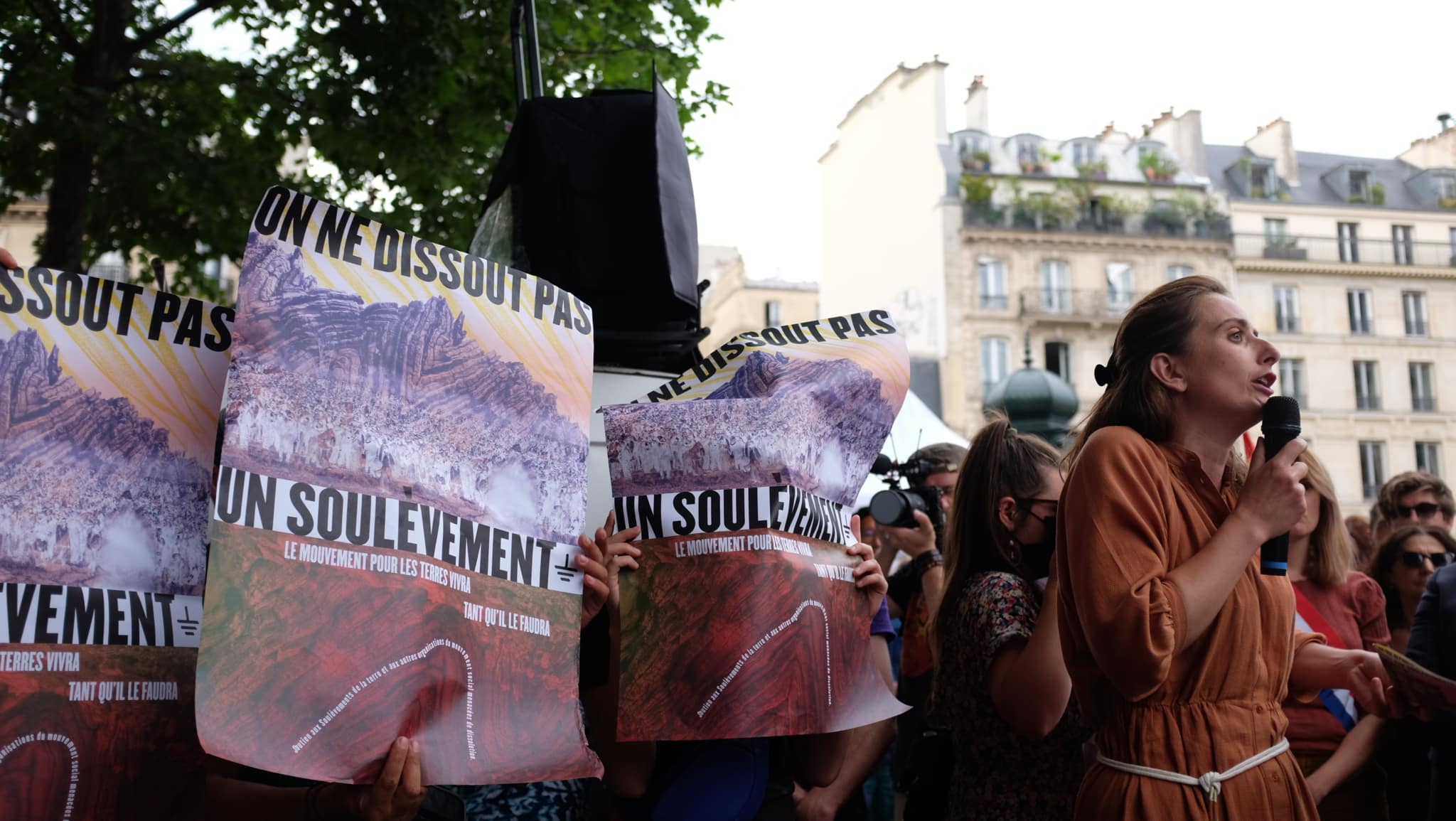 «Nous sommes les Soulèvements de la Terre», répétaient les syndicalistes, politiques et activistes écologiques rassemblé·es ce mercredi en fin d’après-midi sur le parvis du Conseil d’Etat, venu·es dire leur opposition à la dissolution des Soulèvements de la Terre prononcée quelques heures plus tôt.