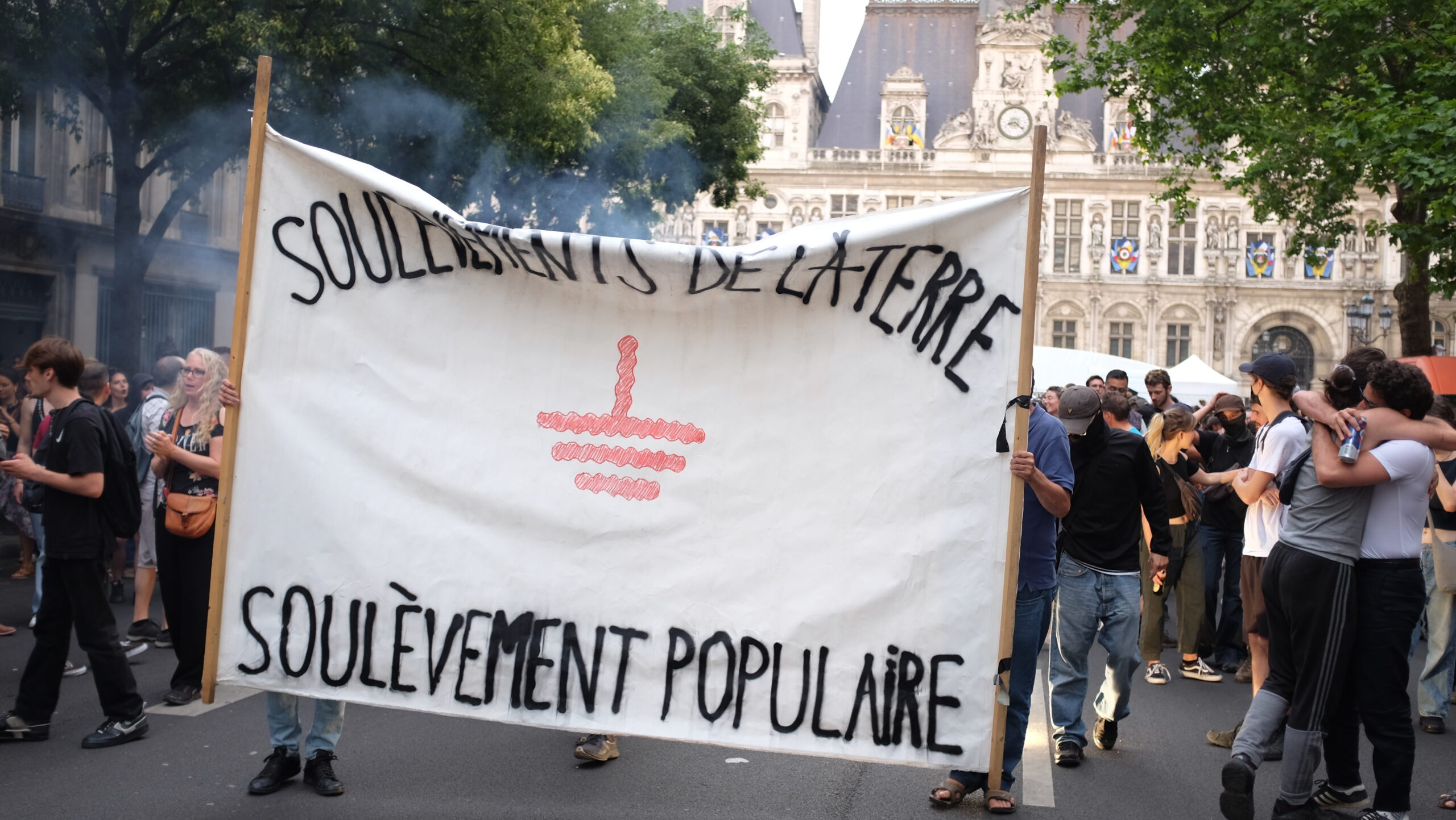 Dans le rassemblement parisien, on préfère mettre en avant le ridicule de la situation. «Je propose qu’on se présente tous au commissariat pour qu’ils voient que c’est impossible de dissoudre un mouvement !», lance un manifestant à la foule bloquée par un important cordon policier. En tout, plus de 150 rassemblements de soutien ont été organisés mercredi soir à travers la France. Les Soulèvements de la Terre appellent déjà à de nouvelles mobilisations mercredi prochain, ainsi qu’«à continuer de faire apparaître le mouvement de 1 000 manières dans l’espace public».