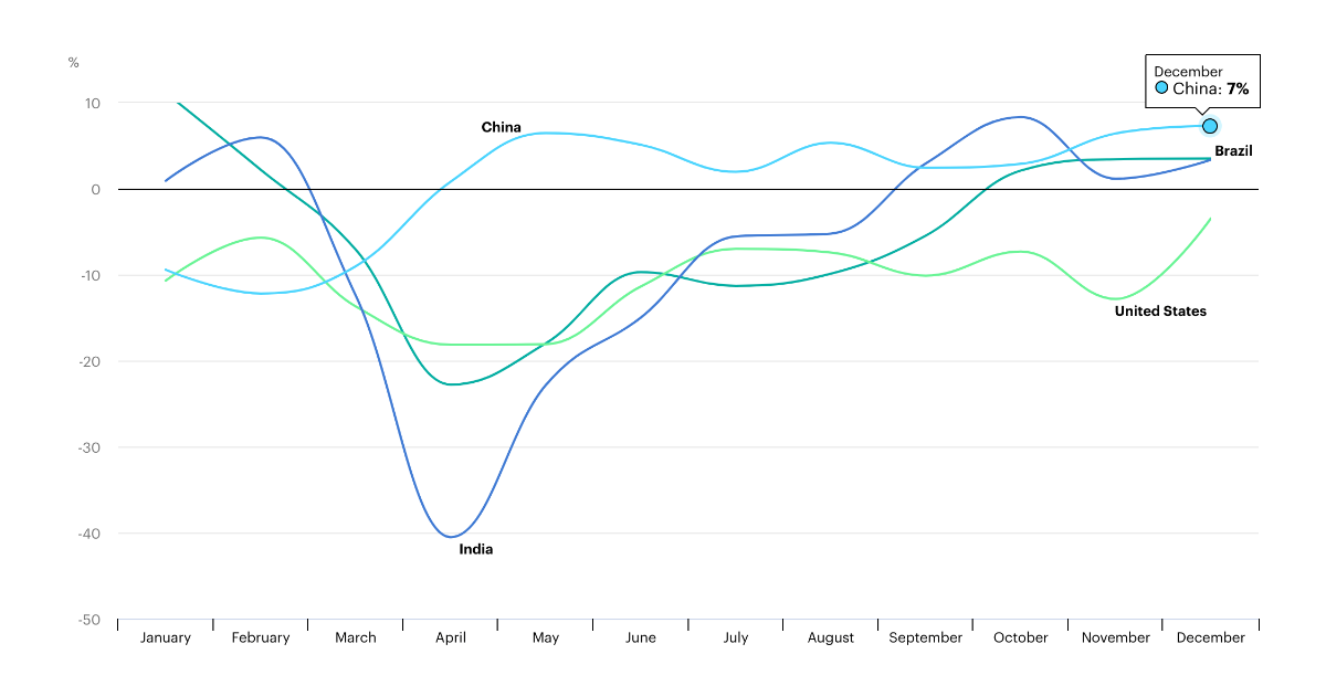 Après avoir atteint un point bas en avril 2020, les émissions mondiales ont rapidement redécollé pour finalement dépasser leur niveau de 2019. En décembre 2020, elles étaient déjà supérieures de 2 % à décembre 2019, soit un écart de quelque 60 millions de tonnes. « Beaucoup d’économies voient désormais leurs émissions grimper au-dessus des niveaux pré-crise », note l’AIE.