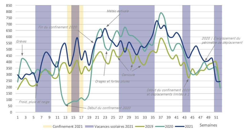 On pouvait craindre que le soufflé ne retombe en 2021. Il n’en fut rien, selon le réseau Vélo et Territoires. Le coordinateur du réseau cyclable national, qui agrège les données de 1 200 compteurs répartis dans toute la France, a constaté une stabilité de la fréquentation en 2021 par rapport à 2020, soit une progression de 28% par rapport à 2019.