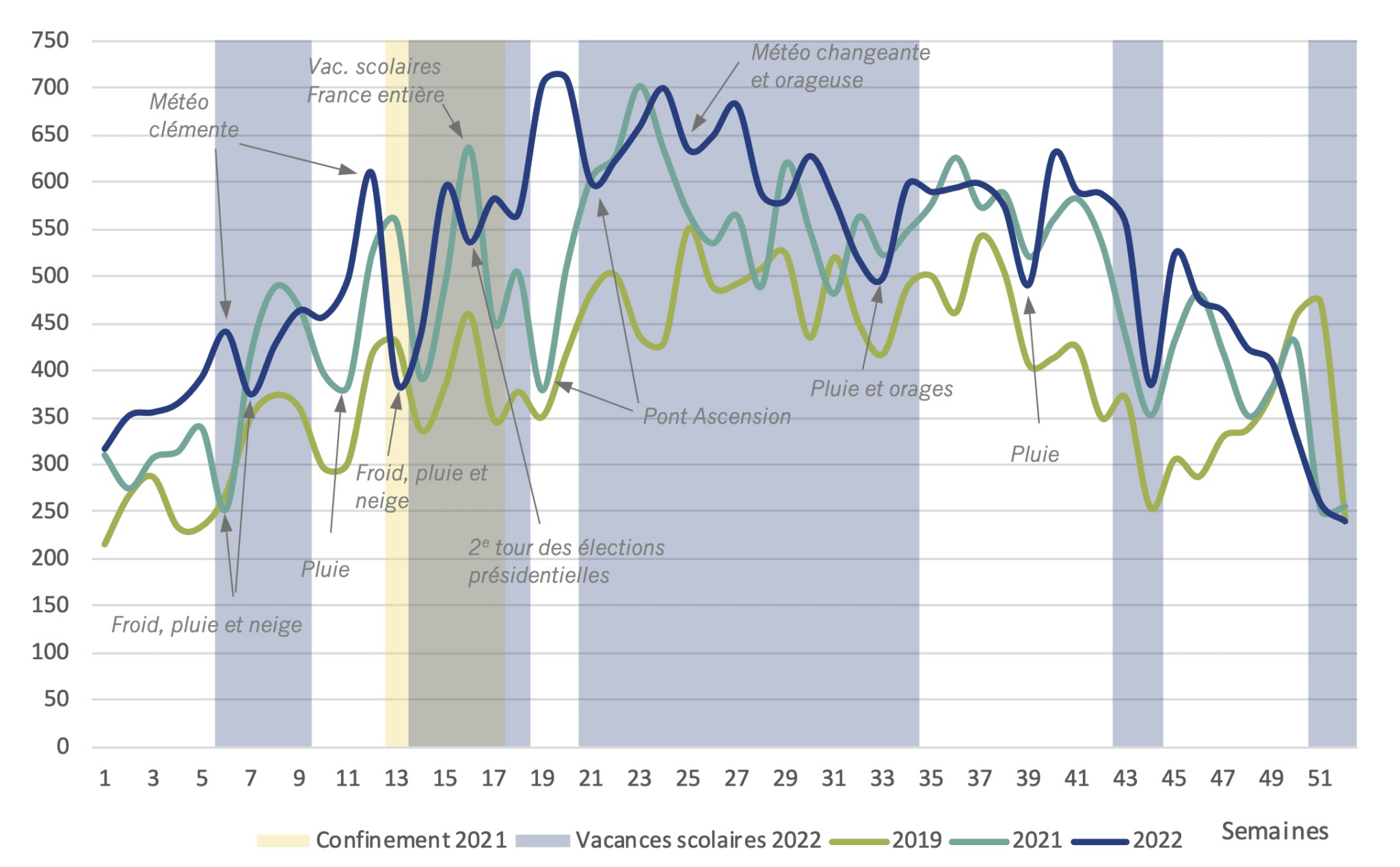 Le bulletin souligne une belle croissance du vélo en ville (+10% par rapport à 2021), avec « une pratique urbaine bien installée qui progresse fortement en semaine ». Le retour au travail en présentiel contribue à cette augmentation. Le bilan est plus contrasté sur le reste du territoire, où le recours au vélo stagne (+0% en milieu périurbain et -1% en zone rurale). Les pratiques y sont « encore fragiles », juge le réseau Vélo et territoires, « sans doute davantage orientées vers les loisirs », avec une sensibilité accrue aux aléas de la météo.