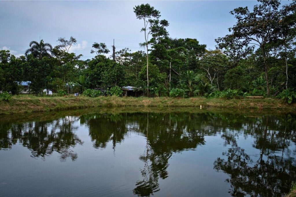 La mare de pisciculture et le paysage du terrain de 12.7 hectares de la coopérative Comuccom, à Puerto Guzman, dans la région du Putumayo dans le sud de la Colombie. © Nolwenn Jaumouillé/Vert