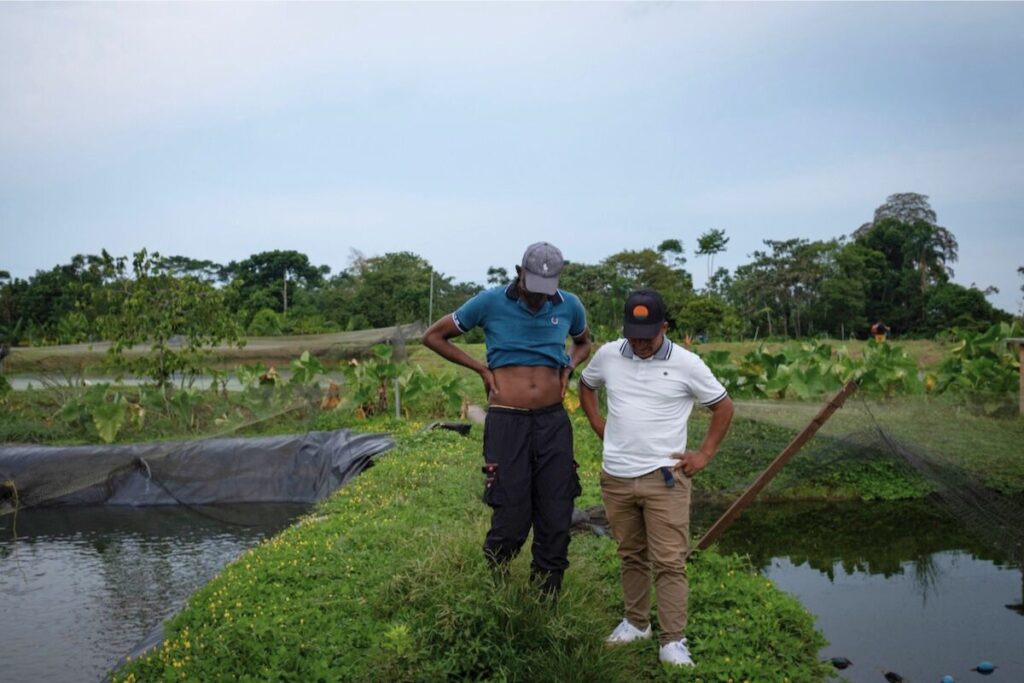 Soraya, femme d’un ex-guérillero de la coopérative Comuccom, sort des poissons du bassin installé à l’entrée de la coopérative pour la vente directe. La pisciculture est l’activité principale de la coopérative, avec la restauration de forêts. ©Nolwenn Jaumouillé/Vert