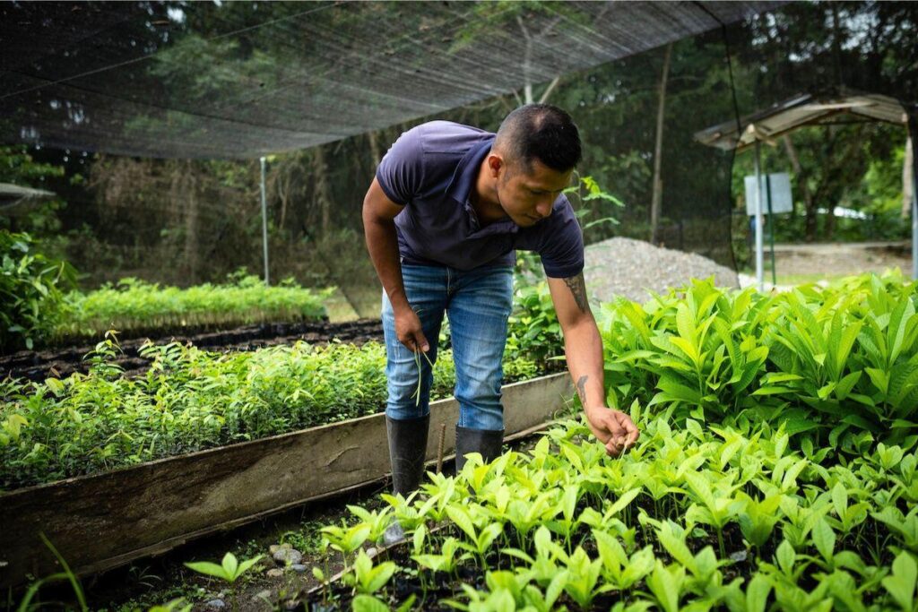 Duberney López Martinéz, ex-Farc, est en charge de la pépinière de la coopérative Comuccom, à Puerto Guzman dans la région du Putumayo. Chaque jour, dès six heures du matin, il inspecte les plants espèce par espèce, désherbe, irrigue, fertilise et sème. ©Nolwenn Jaumouillé/Vert