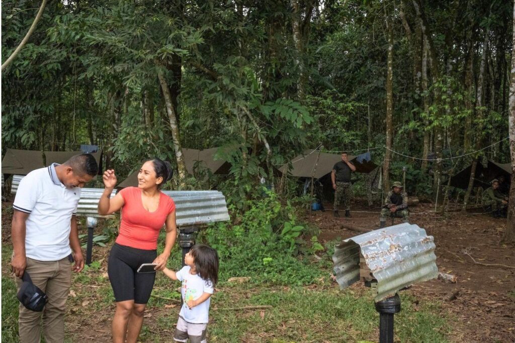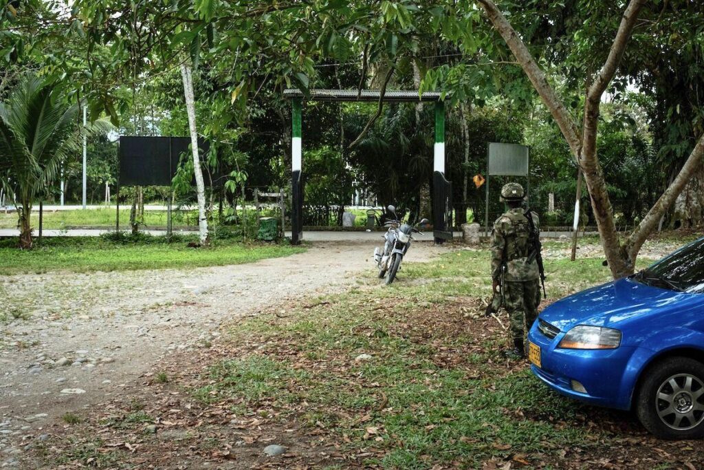 À quelques mètres des ruches, un campement militaire est installé pour protéger la coopérative d’une éventuelle attaque. Le 24 février 2022, des hommes armés sont entrés au sein de la coopérative et ont abattu Jorge Santofimio, qui dirigeait alors la structure. © Nolwenn Jaumouillé/Vert