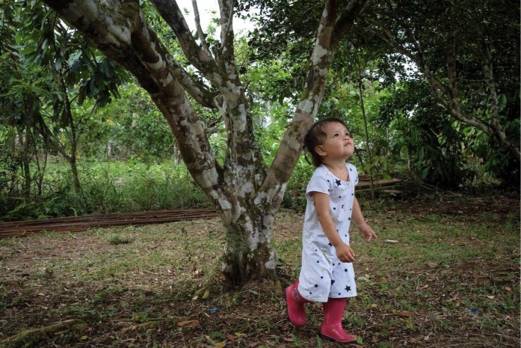Une petite troupe intergénérationnelle s’élance joyeusement dans la «zone de restauration écologique» : sur 1,8 hectare de son terrain, la coopérative a «replanté 1 600 arbres amazoniens de dizaines d’espèces différentes de bois et de fruits de la région», explique le président de Comuccom, Julio José Arroyo. «Goûtez ce cupuaçu», propose une femme en suçant la pulpe juteuse et sucrée qui enrobe la graine de ce cousin local du cacao.