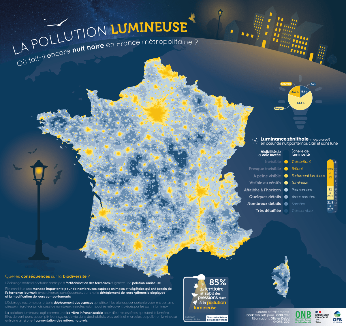 En France, 85% du territoire métropolitain est exposé à un niveau élevé de pollution lumineuse selon un nouvel indicateur développé par l’Observatoire national de la biodiversité (ONB) en novembre 2021. Et au-delà des végétaux, cette pollution affecte aussi largement les animaux. Comme Vert l’expliquait en septembre dernier, la majorité des animaux sont nocturnes et se retrouvent directement perturbés par l’éclairage artificiel. Après l’usage des pesticides, la pollution lumineuse est d’ailleurs l’une des causes majeures de la mortalité des insectes selon une étude publiée dans la revue scientifique Biological Conservation en 2020.