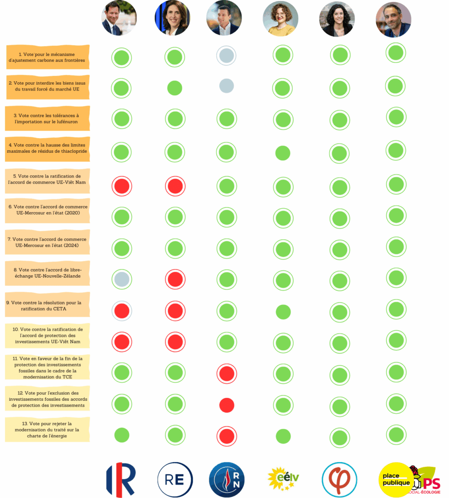 Sur la question du commerce extérieur, au même titre que les Verts ou les Insoumis, les élu·es PS-PP ont voté contre les accords de libre-échange avec le Mercosur (le marché sud-américain), la Nouvelle-Zélande, et le CETA (avec le Canada). C’est ce que révèle l’institut Veblen, dans une note sur les votes majeurs de la mandature 2019-2023 en matière de politique commerciale européenne et dont est extrait le tableau ci-dessous.